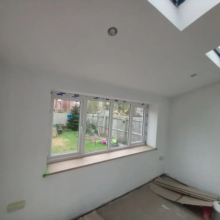We delivered a design and build project featuring a stunning rear extension with a vaulted ceiling and skylights, flooding the space with natural light. To add a warm touch, we installed a beautiful oak internal window board.