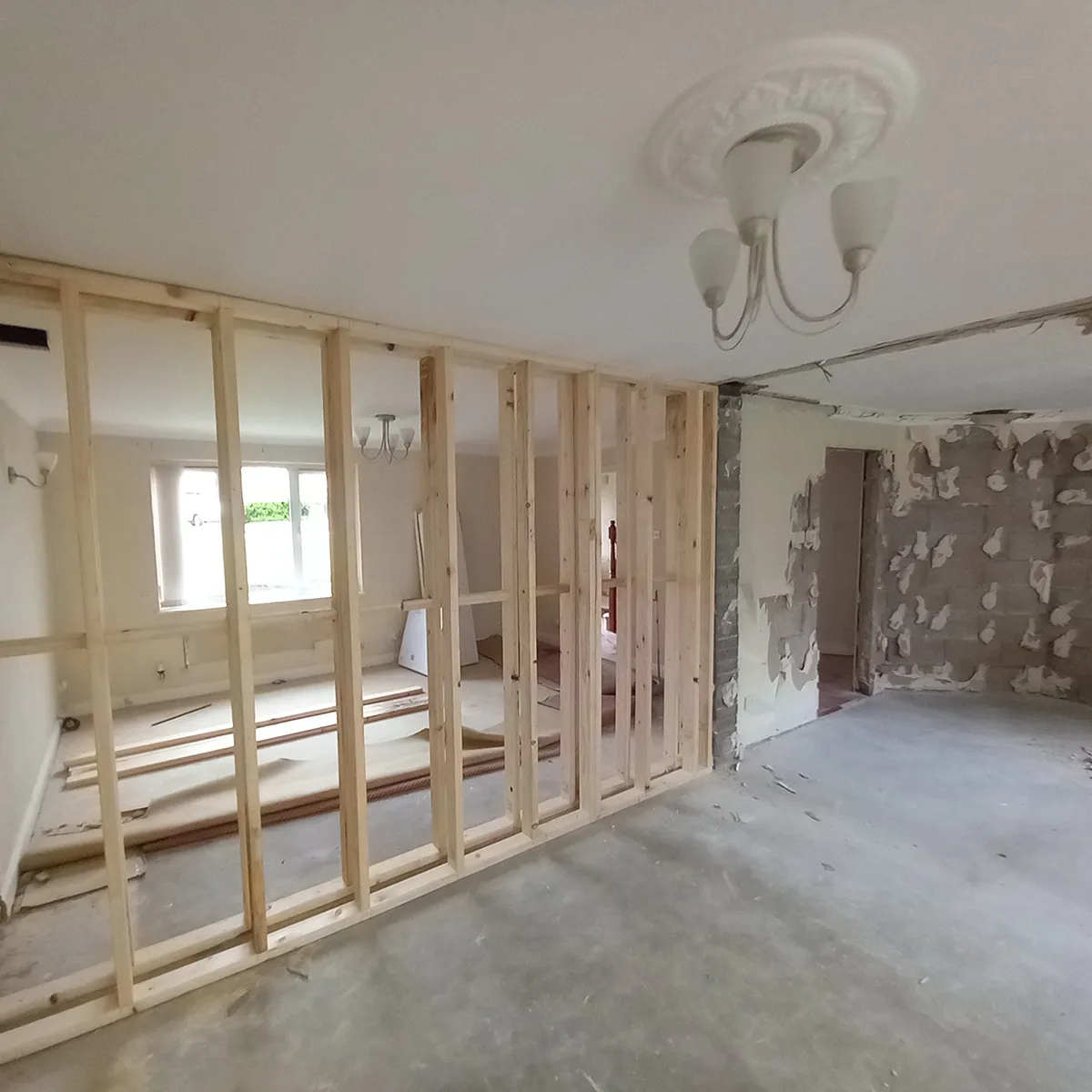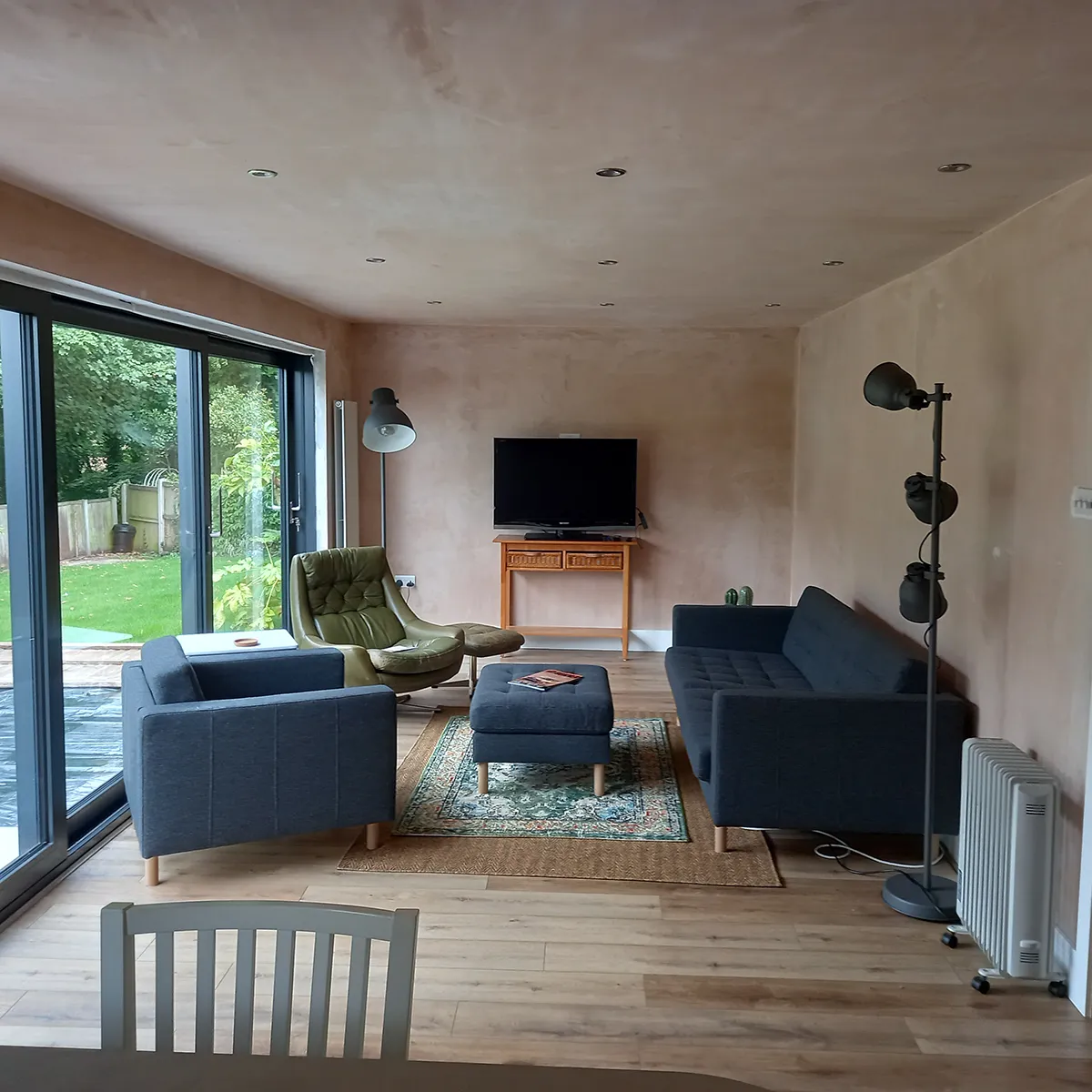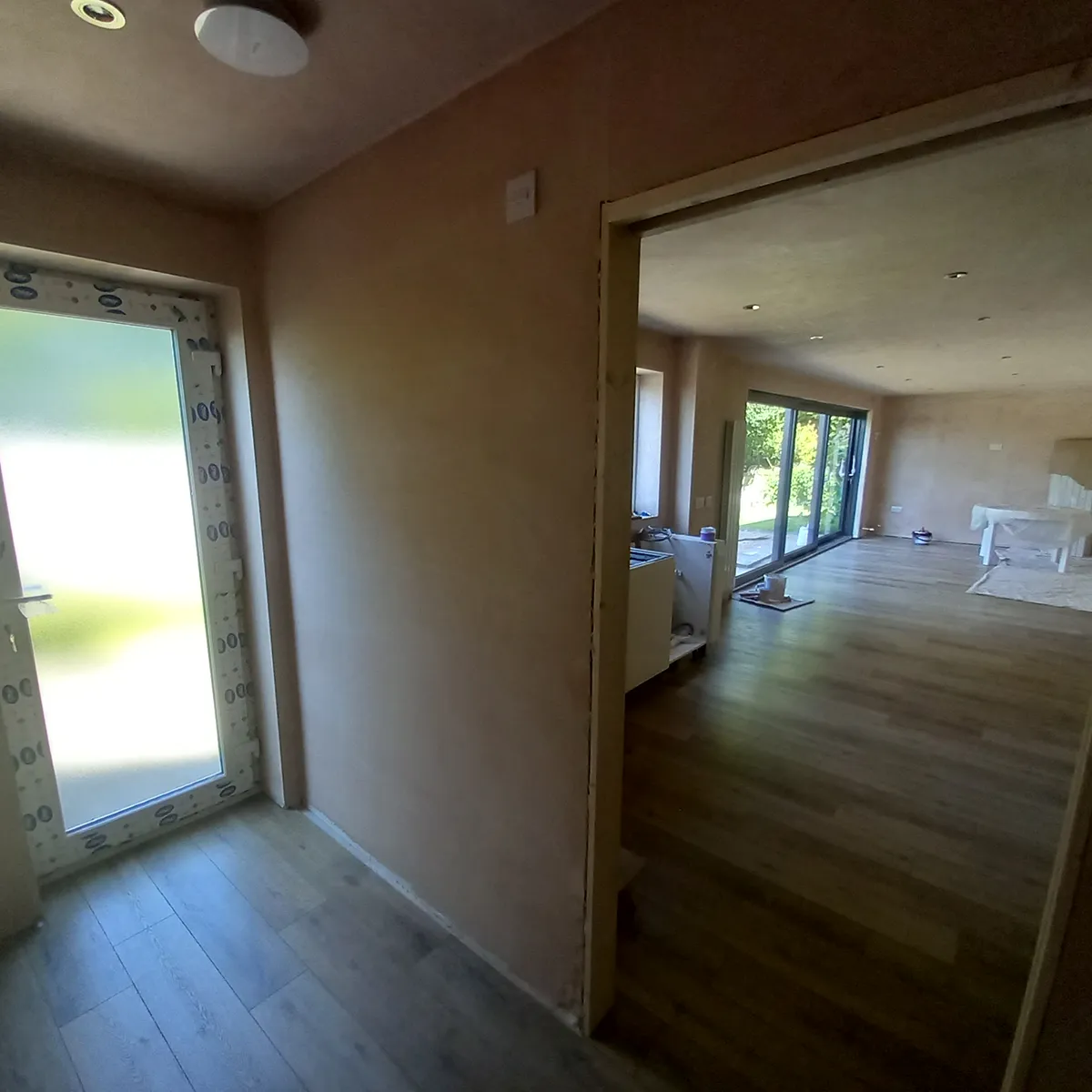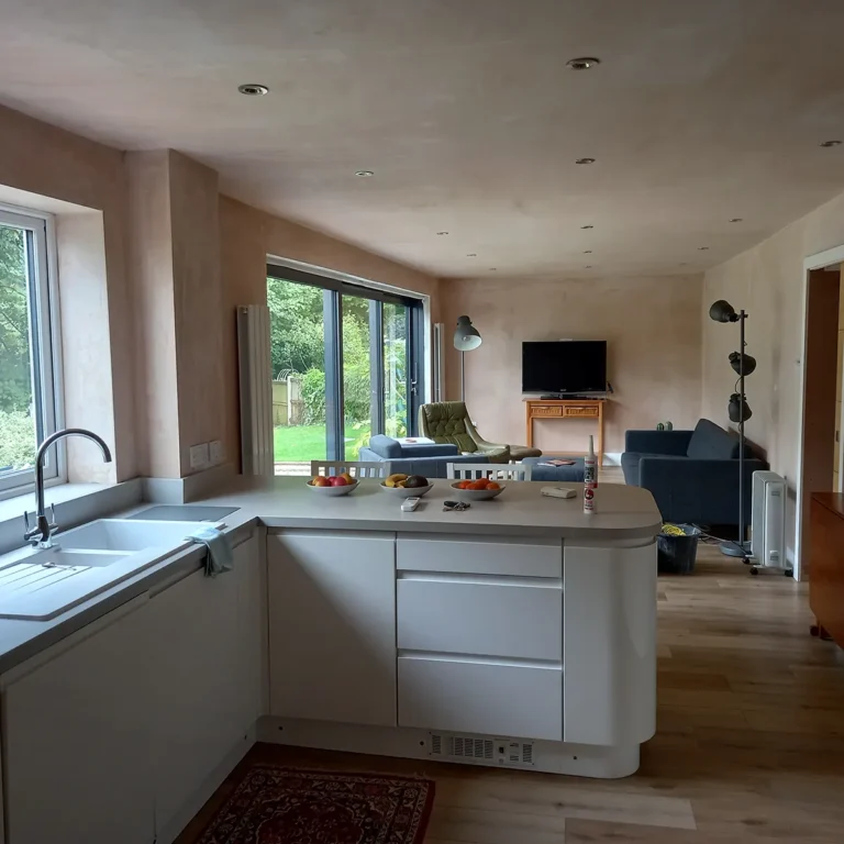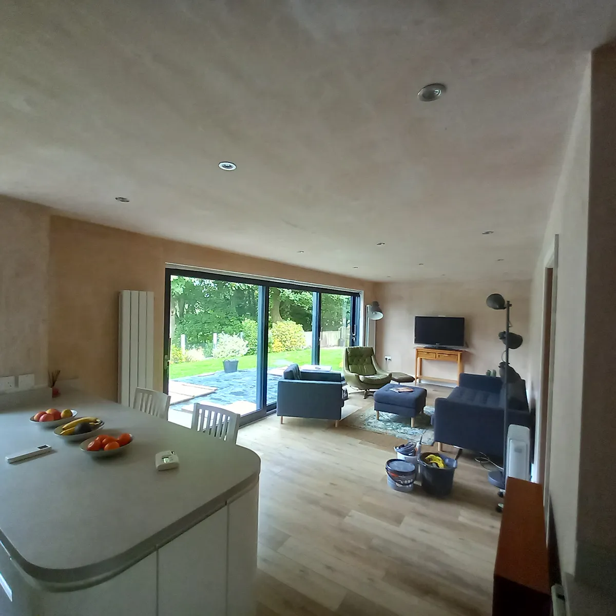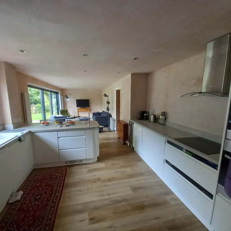We completed a design and build project that included a structural knockthrough and the installation of sleek aluminium large-leaf sliding doors. The space was finished with floor screeding, reconfigured electrics for the upgraded kitchen, and stylish Karndean flooring throughout.
